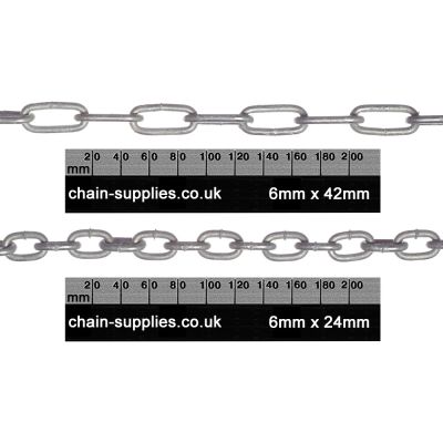 Our 6mm steel welded chain is a medium-weight chain which is perfect for uses including security, hanging signs / lights / other objects, car park boundaries. The short-link chain (6mm x 24mm) has a shorter link length, and so a smaller gap between links. Given that there is more steel in a short-link chain, it is heavier than the long-link option.